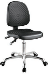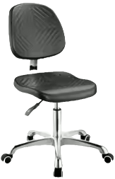 This laboratory chair features a backrest adjustable forward and backward, seat height adjustable from 515-705mm, and is made of 100% polyurethane with anti-static resistivity (10E6–10E9Ω).